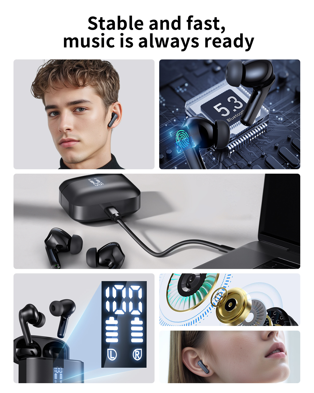Kompaktní bezdrátová sluchátka s technologií Bluetooth 5.3 zajišťují rychlejší a stabilnější připojení pro každodenní poslech. Automatické párování na jedno klepnutí umožňuje okamžité používání a pohodlnou bezdrátovou svobodu. Nabíjecí pouzdro s kapacitou 320 mAh prodlužuje dobu používání při práci, studiu i zábavě. Ergonomický design zvyšuje komfort při nošení a sluchátka pevně drží i při pohybu.