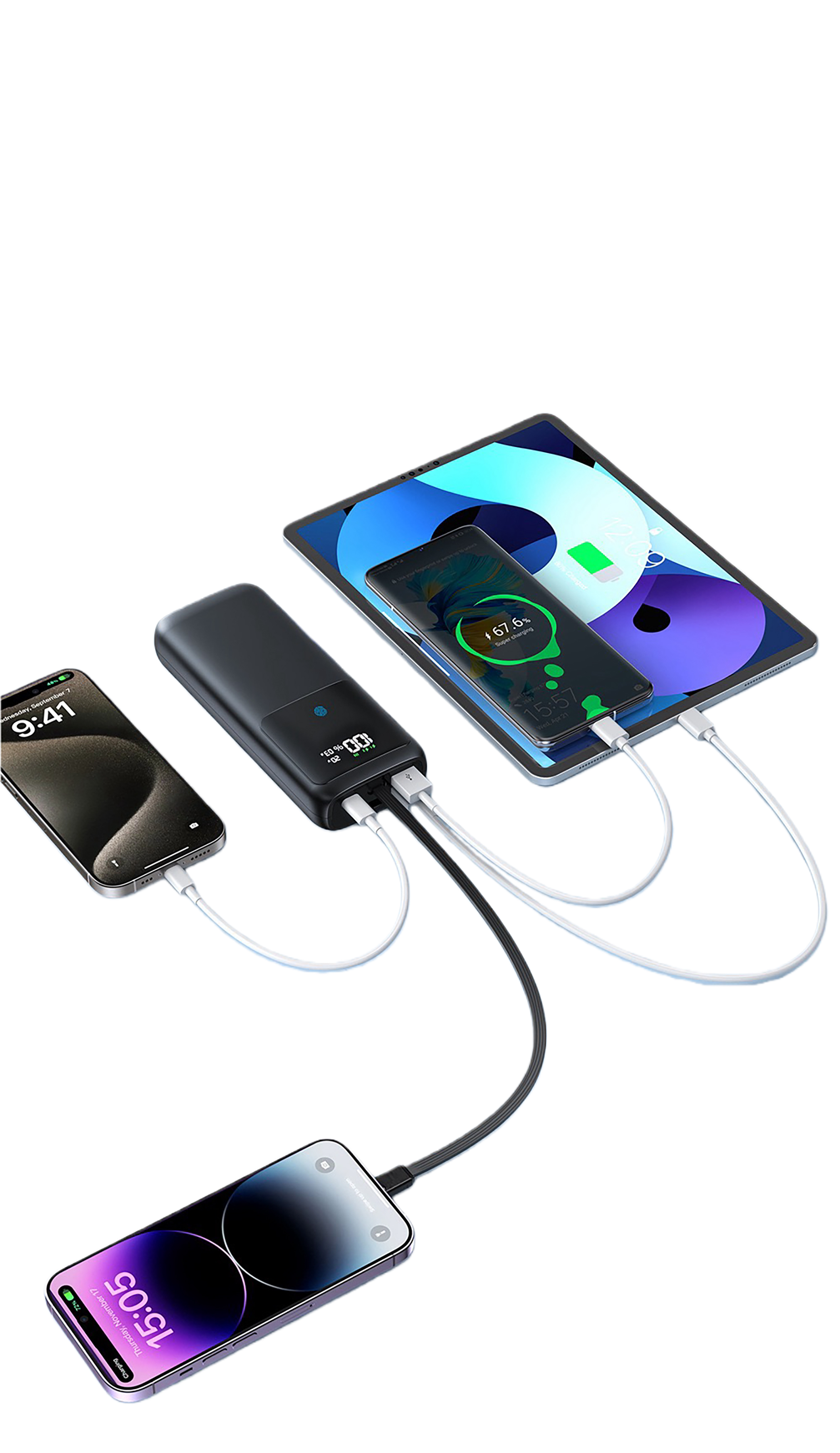 • USB-C kabel + USB-A1 + USB-A2 + USB-C port: 65 W + 15 W