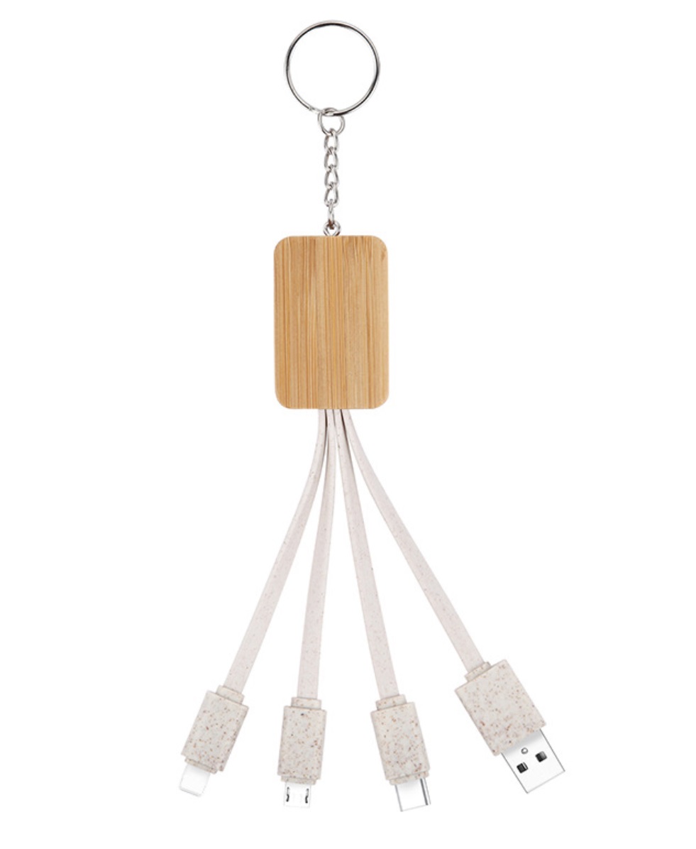 Klíčenka z bambusu s nabíjecím kabelem s konektory Micro USB, USB-C a Lightning. Kabel dostupný ve 2 tvarech, tj. obdelník nebo kulatý. Ideální a praktický reklamní dárek pro firmy a firemní zákazníky.