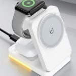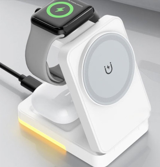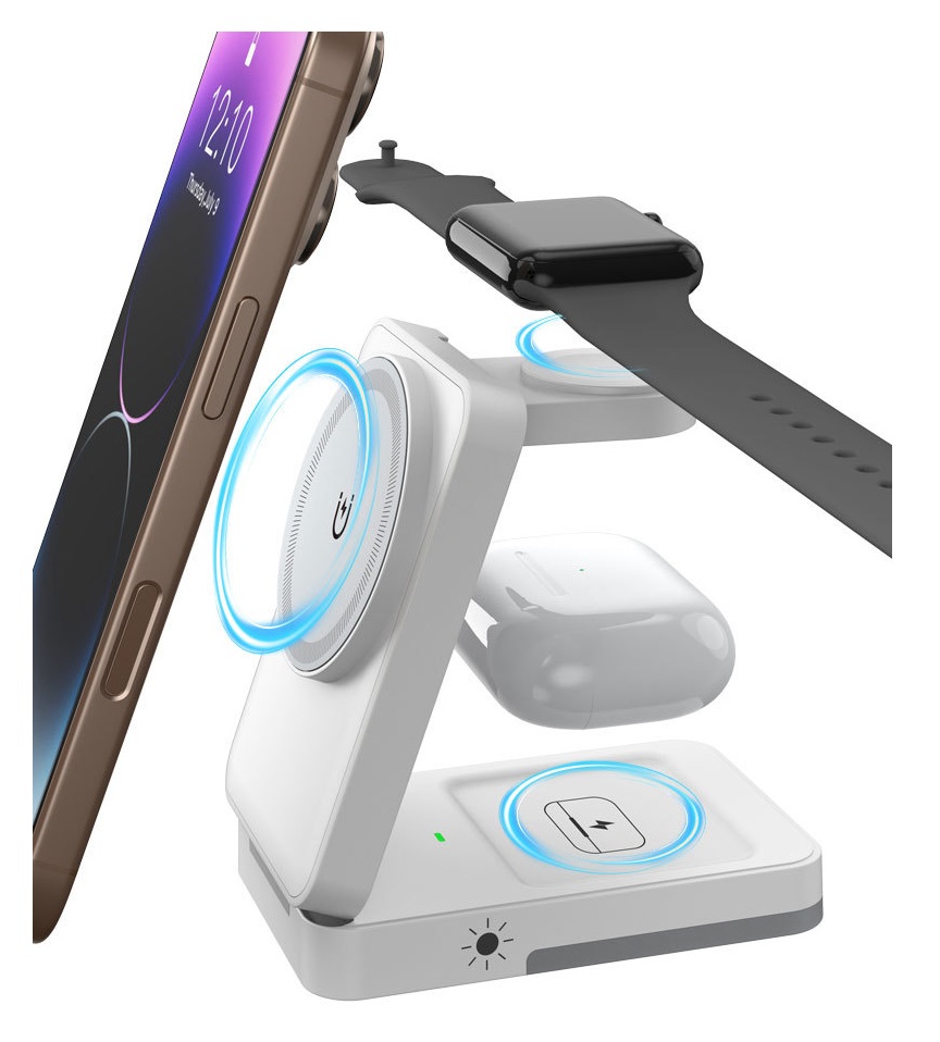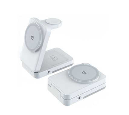 Magnetická bezdrátová nabíječka umožňuje současné nabíjení mobilního telefonu, chytrých hodinek a sluchátek AirPods. Podporuje více úrovní výkonu – pro mobilní telefon až do 15 W. Konstrukce z ABS materiálu zajišťuje pevnost a dlouhou životnost při každodenním používání. Kompaktní rozměry jsou vhodné na pracovní stůl i noční stolek.
