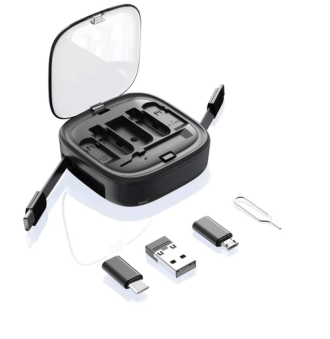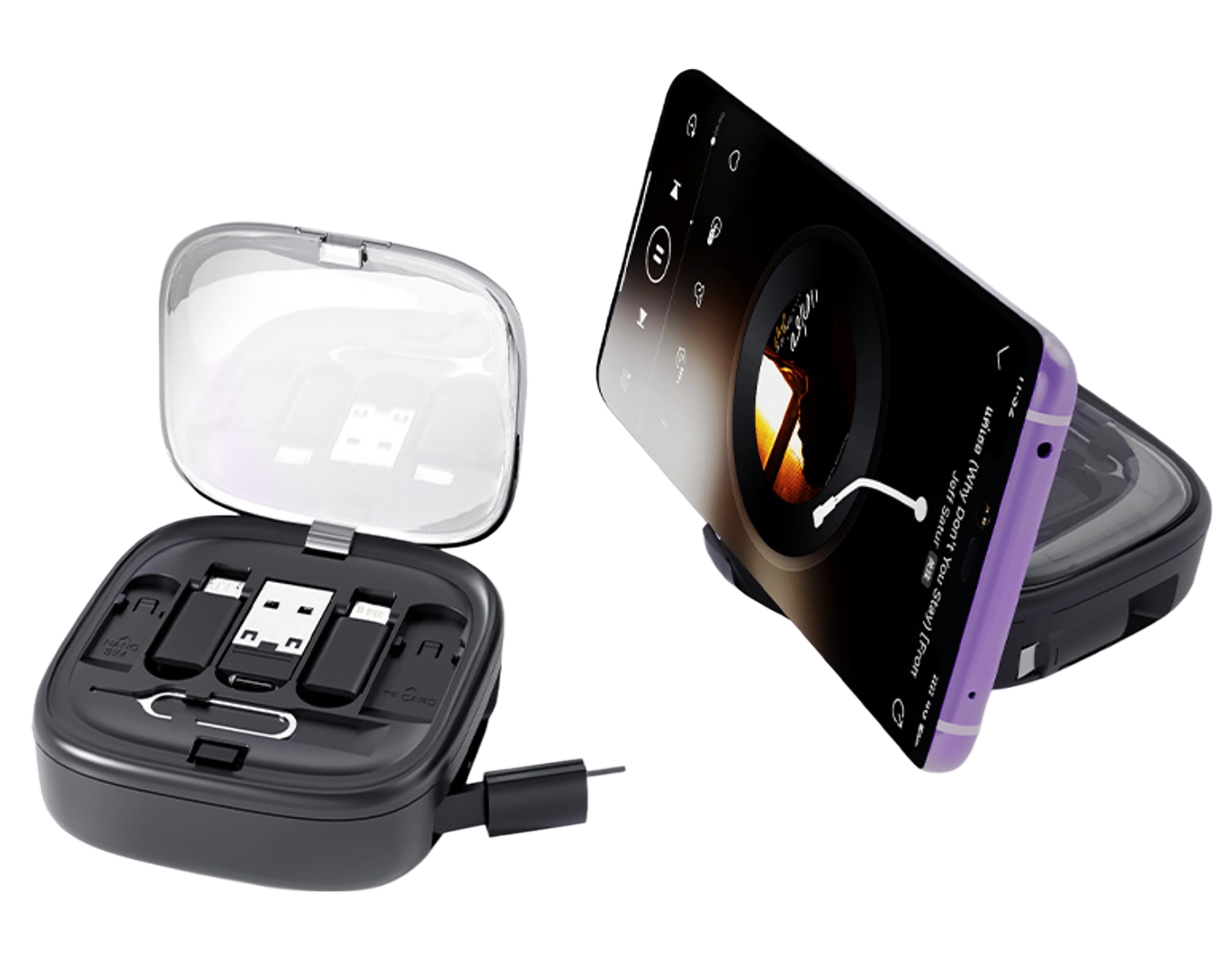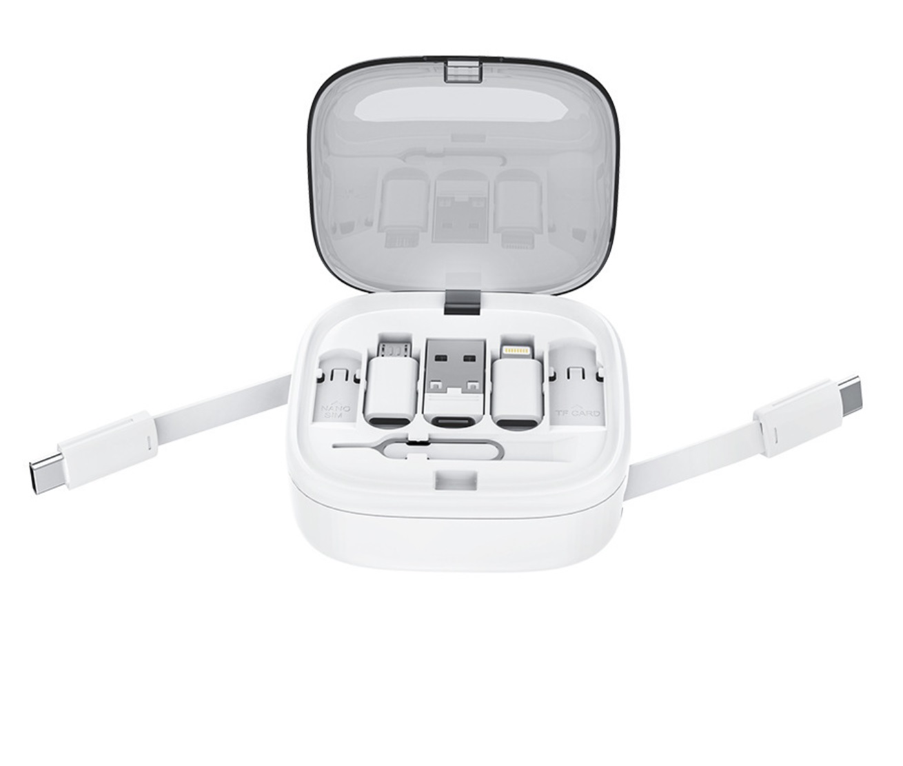 Univerzální kabelová sada kombinuje USB-C kabel (1 m, 60 W) s adaptéry pro Lightning, Micro USB a USB-A. Podporuje rychlé nabíjení až 27 W, nabízí slot pro SIM/TF kartu, nástroj pro vyjmutí SIM a díky ABS konstrukci slouží i jako odolný stojánek na telefon.