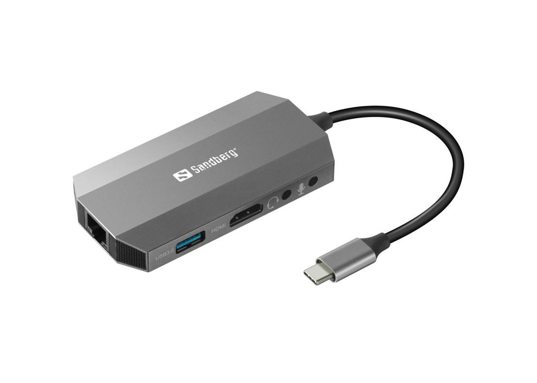 Dokovací stanice Sandberg USB-C 6-in1 Travel Dock poskytuje spoustu užitečných možností na připojení k počítači pomocí portu USB-C.