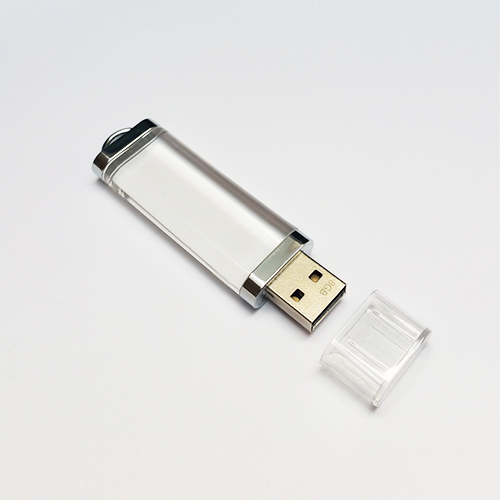Akrylový USB Flash disk s plastovým uzávěrem. Po připojení do počítače je USB podsvícené LED diodou.